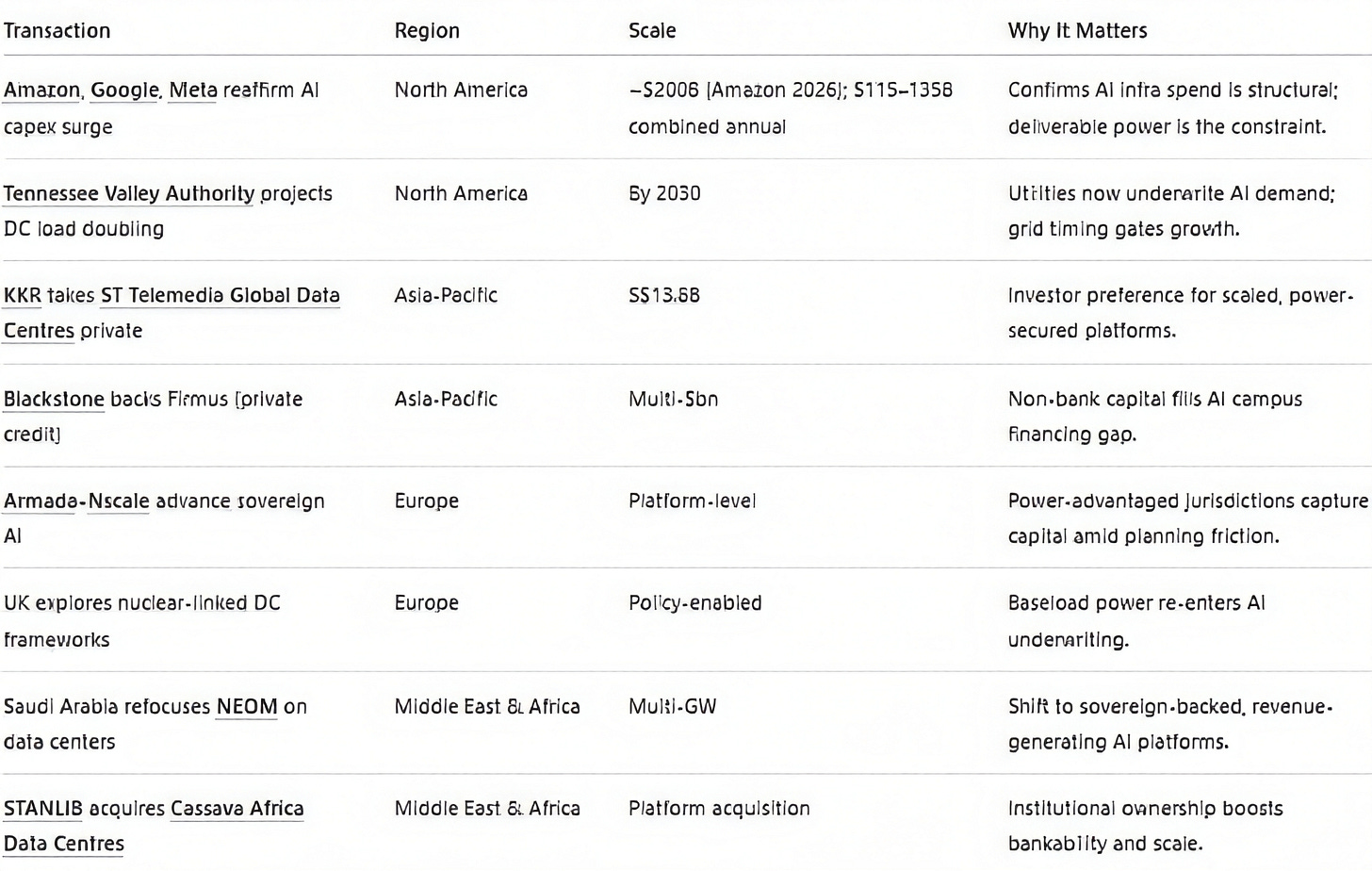 This week made the shift clear. Amazon’s ~$200B 2026 capex, alongside accelerated spend from Google and Meta, is normalizing nine-figure AI infrastructure investment. Power now drives the market: U.S. utility forecasts pace hyperscale growth, APAC capital consolidates around power-secured platforms, and Europe’s sovereign AI ambitions hinge on grid access. In the Middle East & Africa, Saudi NEOM and African institutional ownership show AI compute is treated as national infrastructure, not discretionary tech.