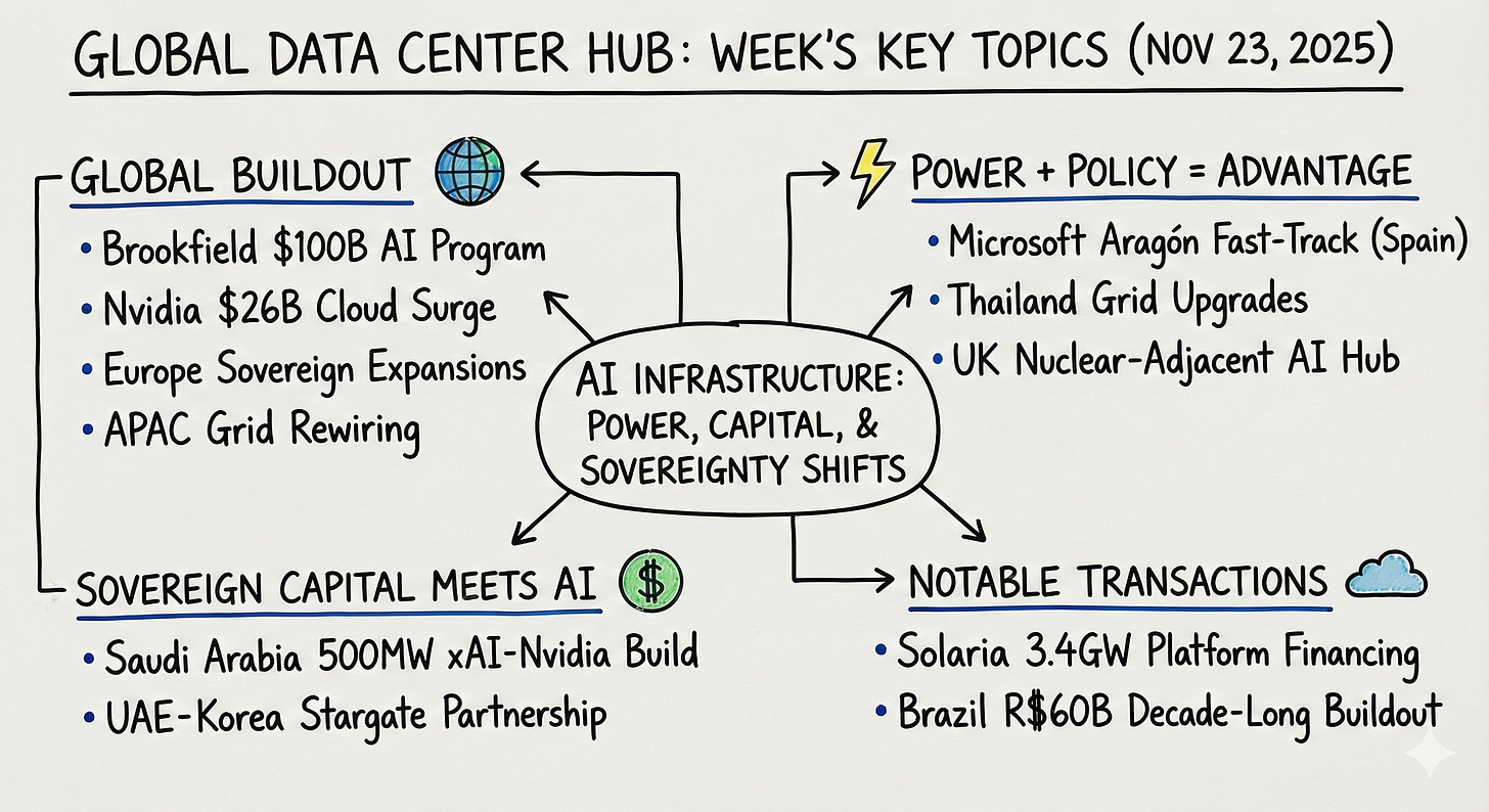 This week, Brookfield launched a $100B AI-infrastructure program, Nvidia accelerated demand with a $26B cloud-capacity push, and Amazon advanced a $3B U.S. hyperscale site. Europe moved on multi-GW approvals and financing, Asia activated tens of billions in AI-and-solar pipelines, and sovereign-backed projects across the Middle East and South America signaled the rise of national compute strategies.
