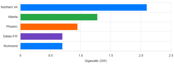 Northern Virginia remains the world’s largest data center market, with 5.6 GW of active capacity and another 5.9 GW planned. But growth is migrating toward Atlanta, Dallas–Fort Worth, Phoenix, and Richmond, where utilities can still allocate multi-hundred-megawatt blocks.