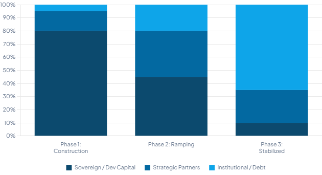 Initial phases are financed like development infrastructure, with sovereign capital absorbing construction, utilization, and technology-cycle risk. Strategic partners contribute execution certainty through equipment access, operating capability, and demand pull-through.