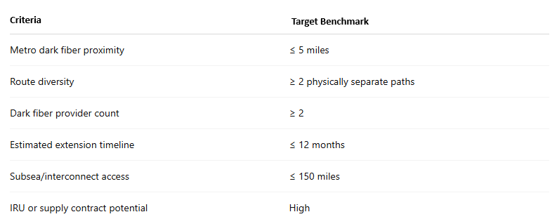Red flag: “Fiber nearby” often means lit-only, low-capacity loops controlled by a single provider. That’s not scale-grade.