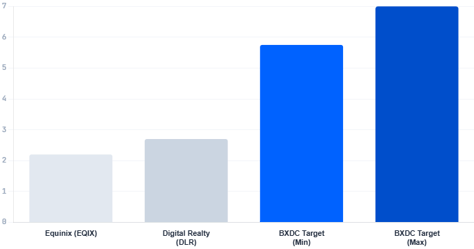 BXDC enters with roughly twice the yield. Pure-play hyperscaler concentration. External management by BX REIT Advisors. Priority acquisition rights over qualifying Blackstone-sourced stabilized assets for 24 months post-IPO. A $25 billion near-term pipeline already under review. Target leverage approximately 40 percent long-term LTV.