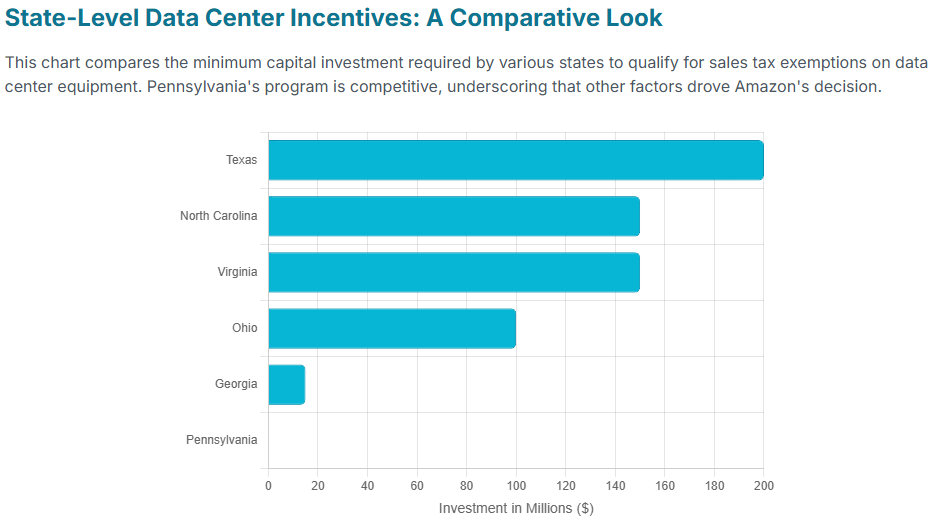 Pennsylvania won this project not with financial subsidies, but with speed. A fast-tracked permitting framework, skilled labor pool, and industrial land reuse made the state a launchpad for Amazon’s broader $30 billion U.S. AI expansion.