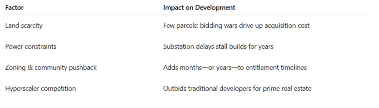 In Tier-1 markets, the core ingredients (land, power, and permits) are in short supply.