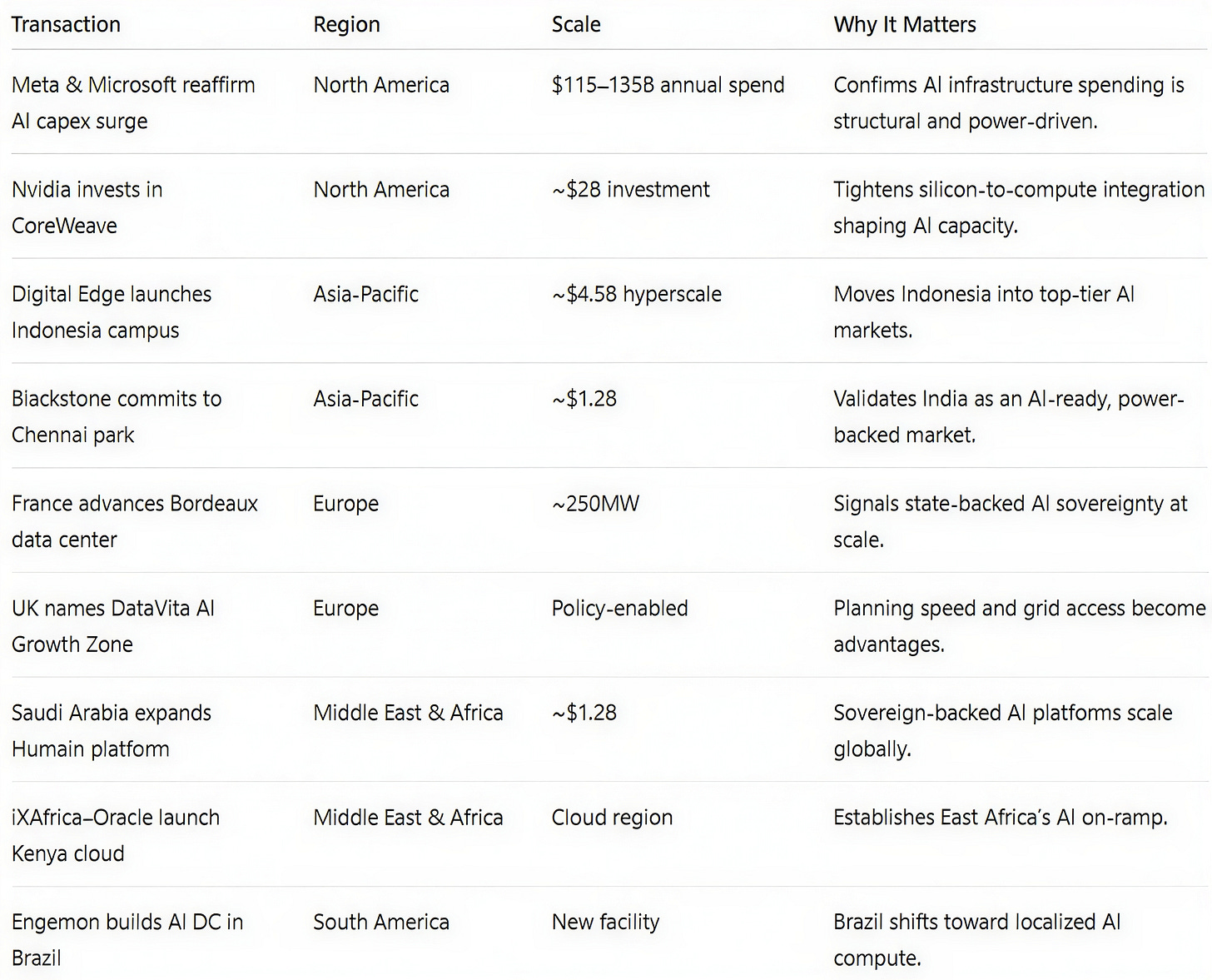 This week confirmed that AI-scale growth is now platform-driven, with capital deployed in repeatable programs anchored by secured power, long-term capital, and rising sovereign alignment.