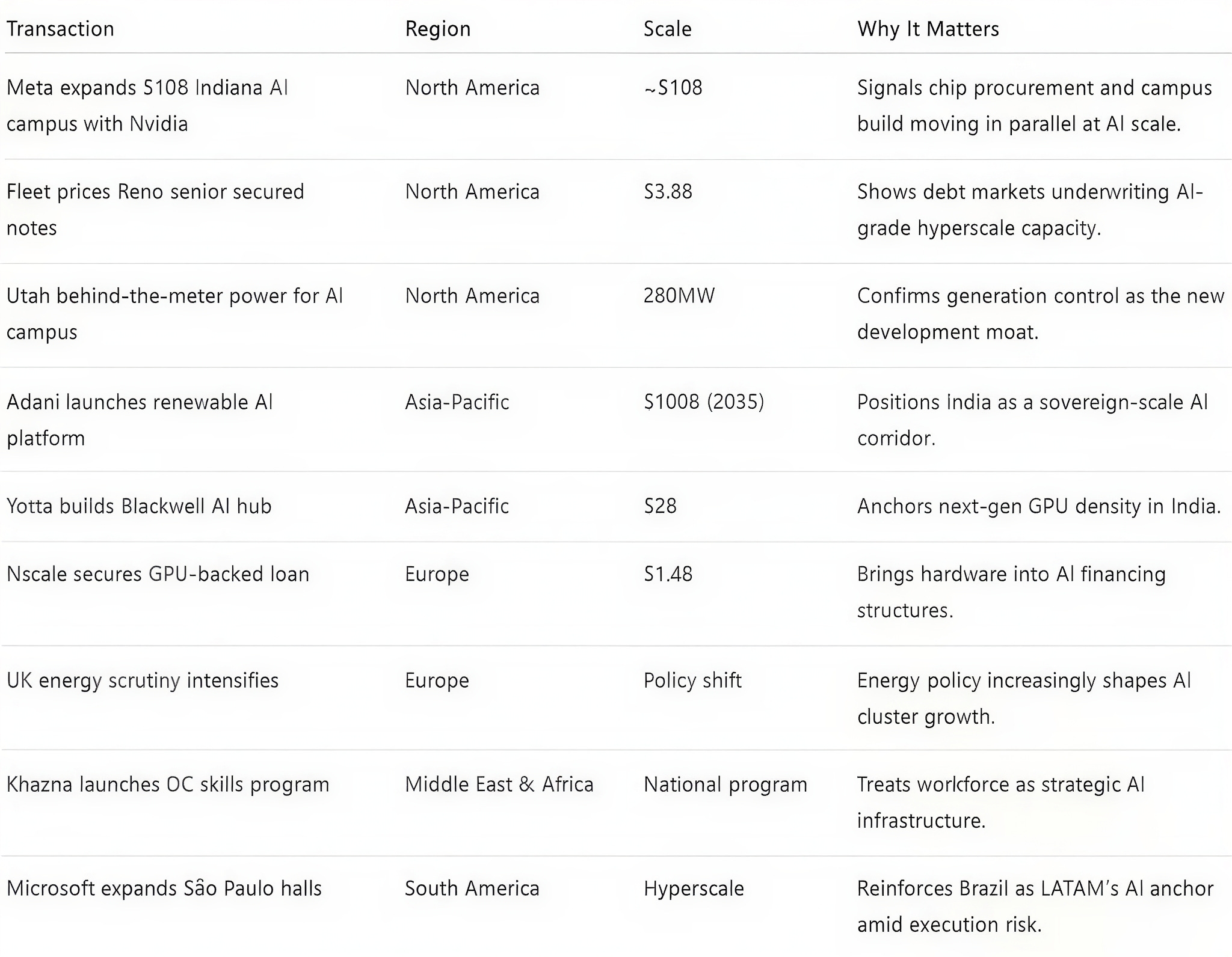North America — Meta’s $10B Indiana campus and expanded Nvidia integration, alongside Fleet’s $3.8B secured notes in Reno, reinforced a defining U.S. pattern: hyperscale AI growth is concentrating where capital markets and grid positioning already align. In Utah, a 280MW behind-the-meter structure for a proposed 10GW campus shows developers underwriting generation before tenants. Firm power and interconnect certainty not financing depth are emerging as the decisive constraints.