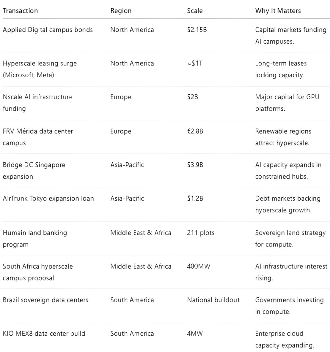 This week confirmed AI-scale infrastructure is moving deeper into institutional capital markets, with energy access increasingly shaping project viability. The advantage now favors developers who secure land, grid capacity, and long-term power contracts early.