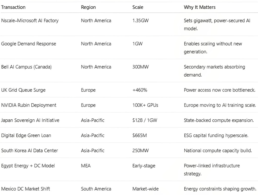 Hyperscalers and partners are committing to record-scale capacity. The 1.35GW U.S. AI factory and sovereign builds in Japan and South Korea set long-term compute as the baseline, while Canada absorbs overflow demand. Strategic global capital like Indonesia’s $665M green loan and multi-billion-dollar Asian programs is driving the shift to platform-level deployment.