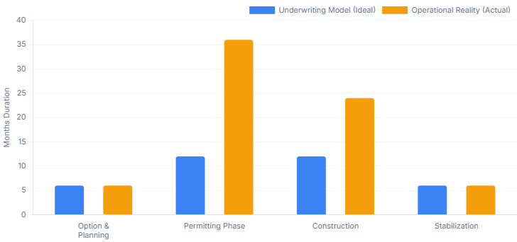 The underwriting model assumed three years from option signing to stabilized income. Then the permitting reality hit.