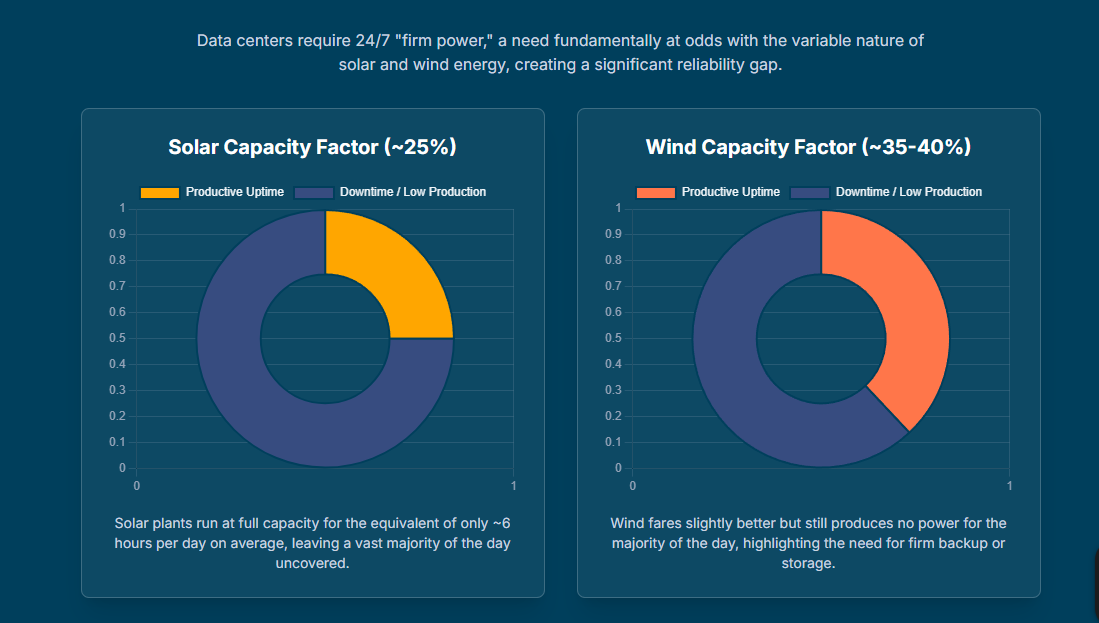 AI workloads demand continuous, high-density power, but renewables are intermittent.