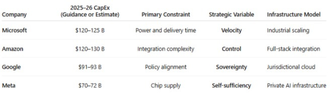 Microsoft, Amazon, Google, and Meta have committed over $300 billion in combined annual capital expenditures more than Japan or India’s national infrastructure budgets. Yet each is optimizing a different strategic variable: velocity for Microsoft, integration for Amazon, sovereignty for Google, and reinvention for Meta.
