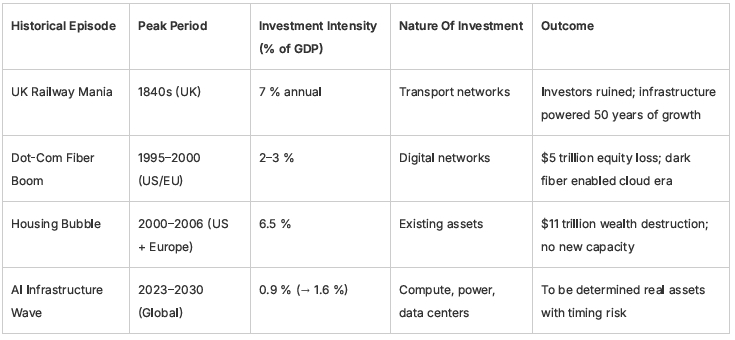 By scale, today’s AI investment is smaller than the manias of the past. But in nominal terms, the dollar amount dwarfs them all. The AI buildout is deploying more capital per year than the entire dot-com cycle did over its lifetime.