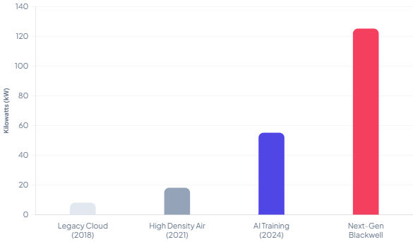AI deployments that used to fit inside “high-density air” assumptions (think 10–20 kW/rack) are now being planned at 50–100 kW/rack and beyond, with bleeding-edge training configurations cited around 120–130 kW/rack. In that band, cooling is not an OPEX line item. It becomes an architectural constraint that determines which buildings can even participate in the highest-paying segment of demand.