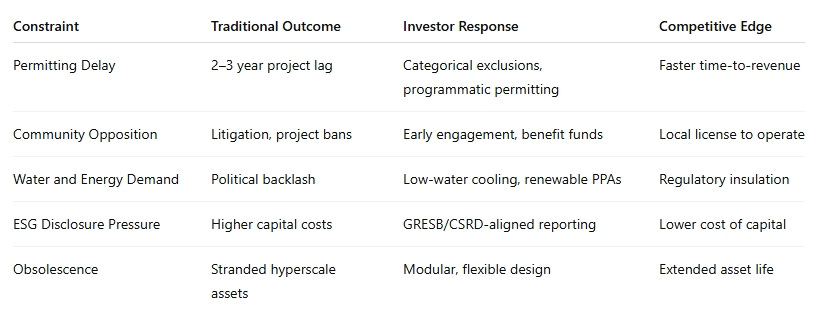 The convergence of extended permitting timelines (now averaging two to three years in major markets), resource scarcity, and aggressive community opposition has transformed sustainability from a “reputation topic” into a binding investment constraint.