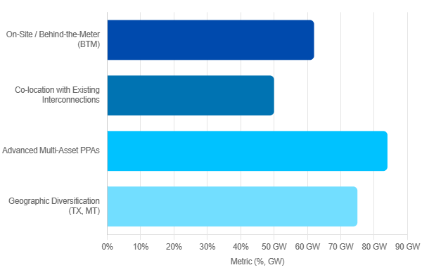The most aggressive data center operators are building their own power plants. 25–33% of new data center demand through 2030 is expected to come from on-site generation. The advantage is time solar-plus-storage systems can be operational in months once permitted, compared to years for grid-tied projects.