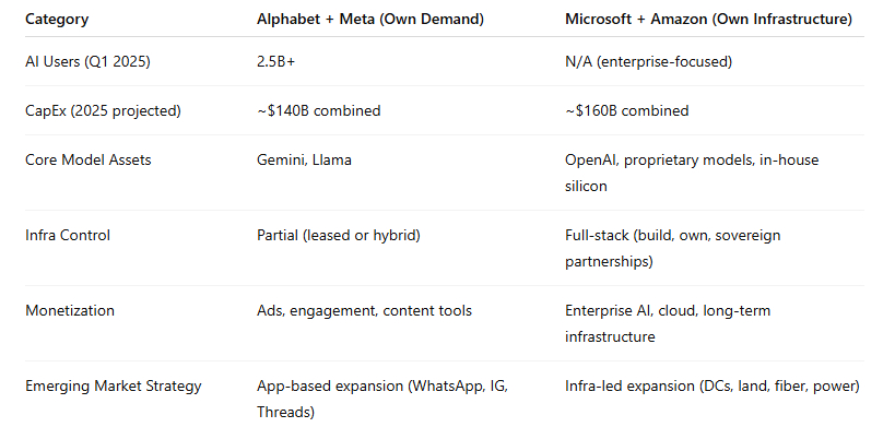 Alphabet and Meta are focused on capturing and monetizing global AI demand through consumer products, engagement, and ads.