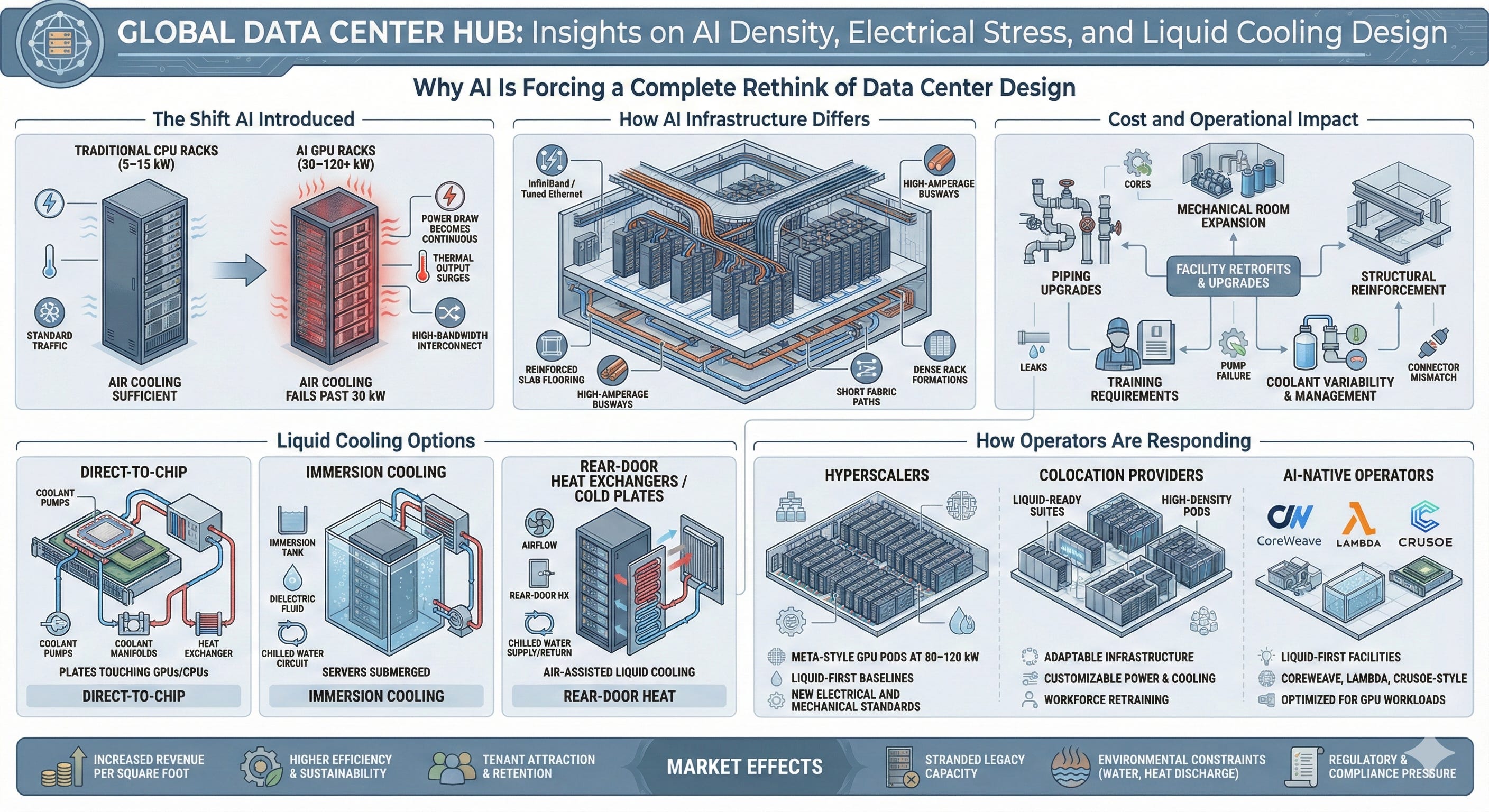 This is a physical constraint, not an operational one. Decades of airflow and mechanical optimization cannot match GPU heat output. The industry is moving toward liquid cooling as the primary method for heat removal, reshaping electrical rooms, hall dimensions, maintenance planning, risk management, and future capacity design.