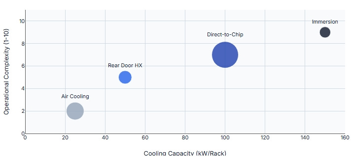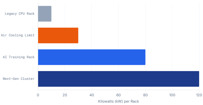 The CPU–GPU gap makes this shift unavoidable. CPU racks draw 5–15 kilowatts; GPU racks start around 30 and can exceed 80–100. Air cooling becomes ineffective as densities approach 30 kilowatts because airflow and temperature limits cap what fans and chilled air can remove.